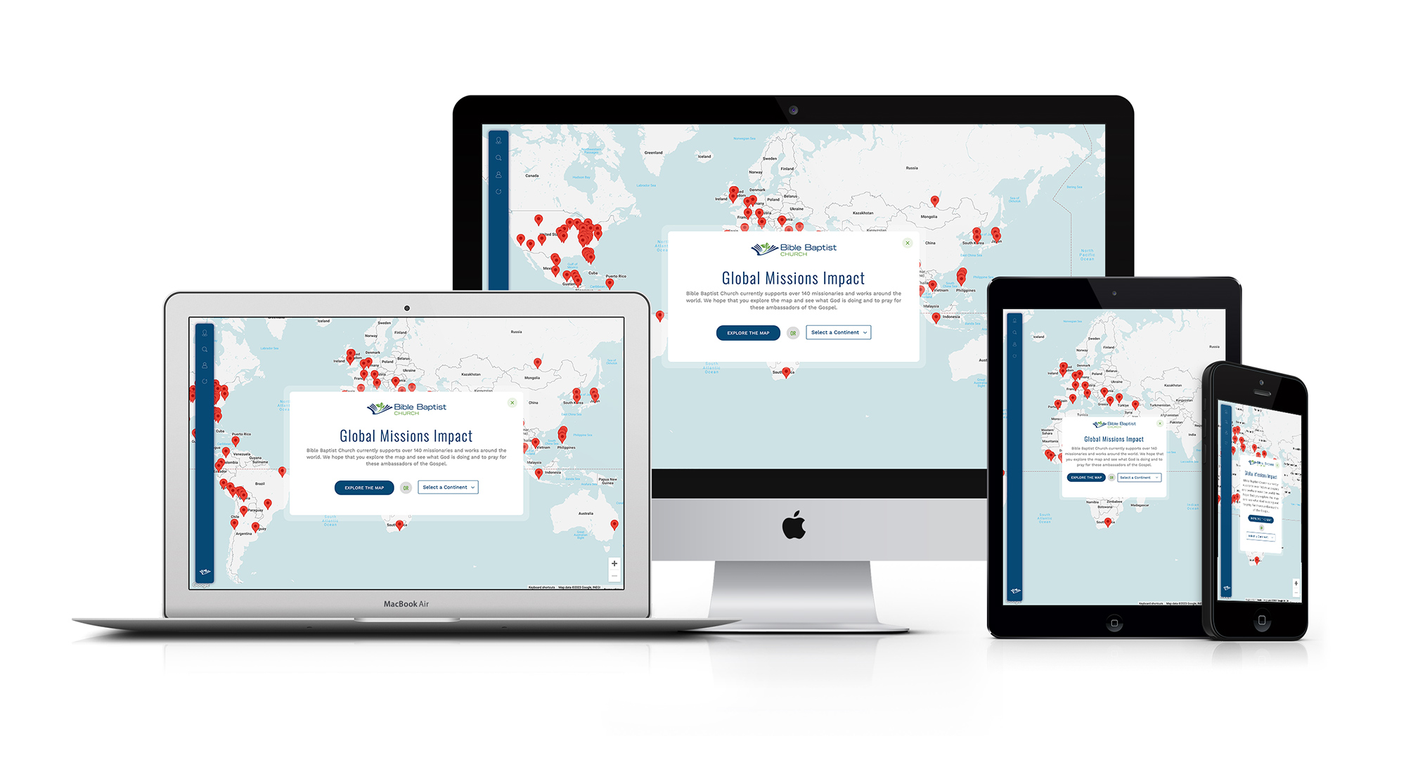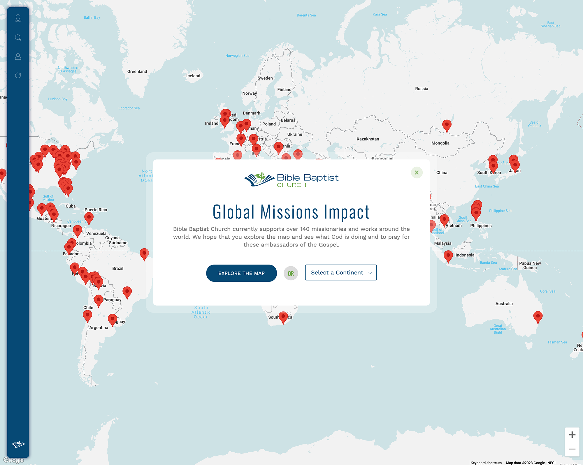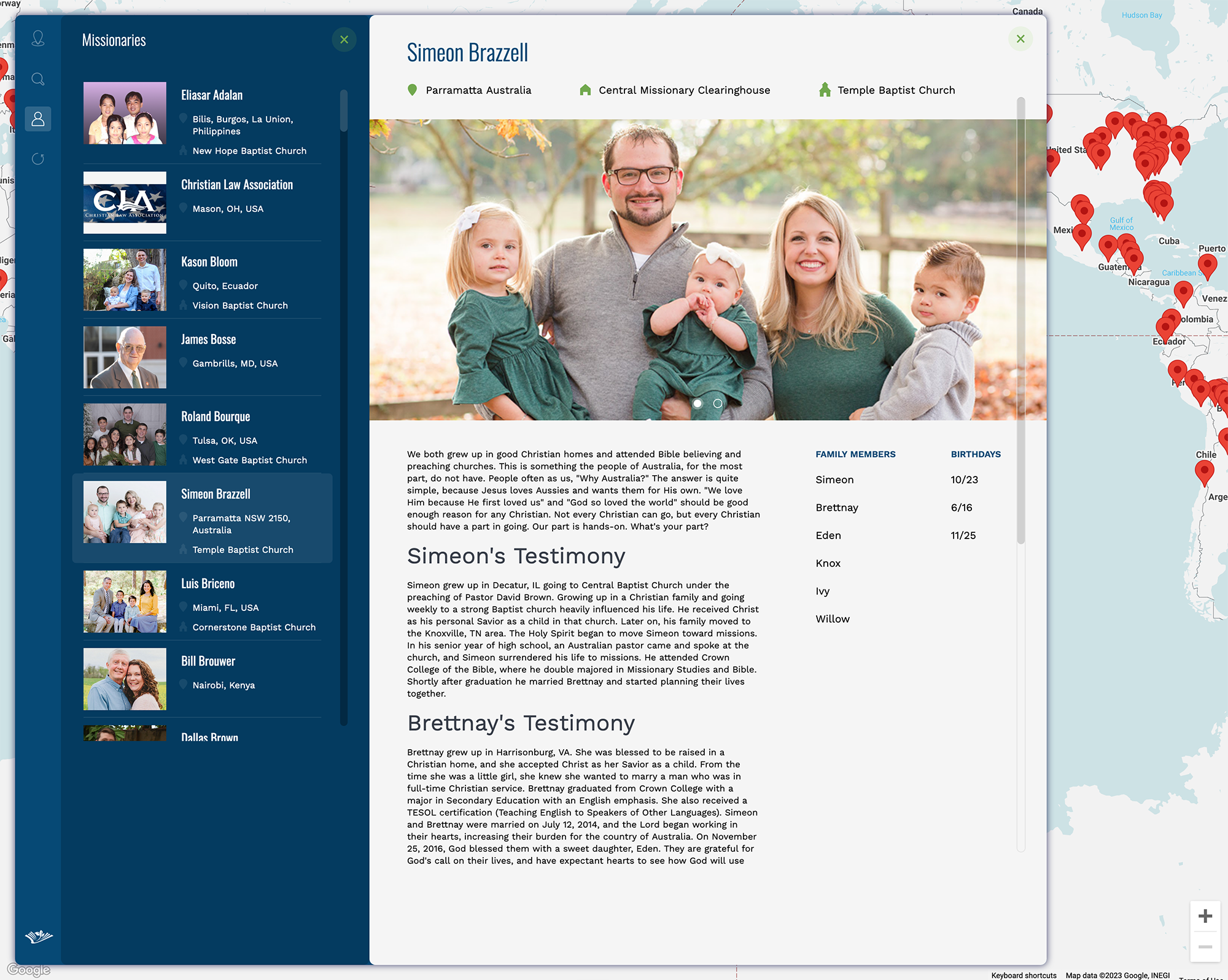 Users can select a map pin or click on a missionary from the sidebar to see their details and information about their mission work.
