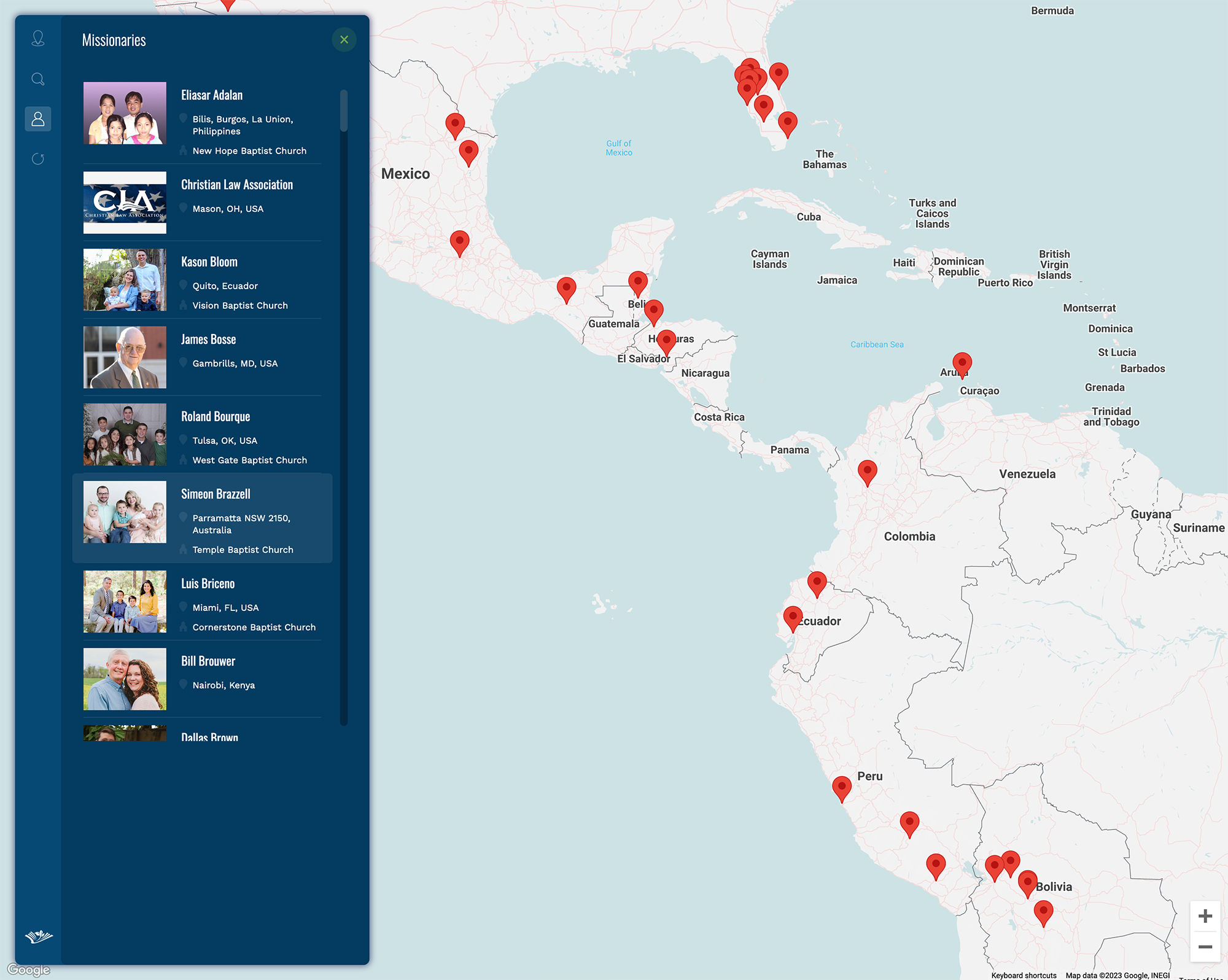 As a user navigates the map or zooms into a continent, they will be provided with a sidebar that lists all the missionaries in that area.