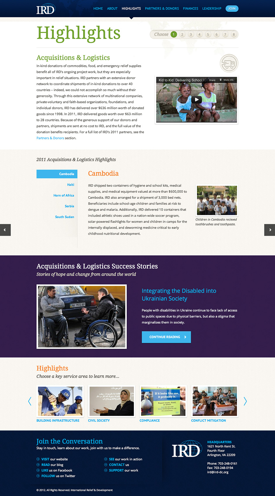 The site tells the story of International Relief & Development's work around the globe from disaster relief to stabilization projects like clean water and road development. It also reinforces their excellent financial stewardship - 91% of every dollar goes out toward relief and development projects. Throughout the site, we've highlighted these projects as well as success stories, the amazing partners and donors who make it all possible, their official financial reports, and the leadership team.