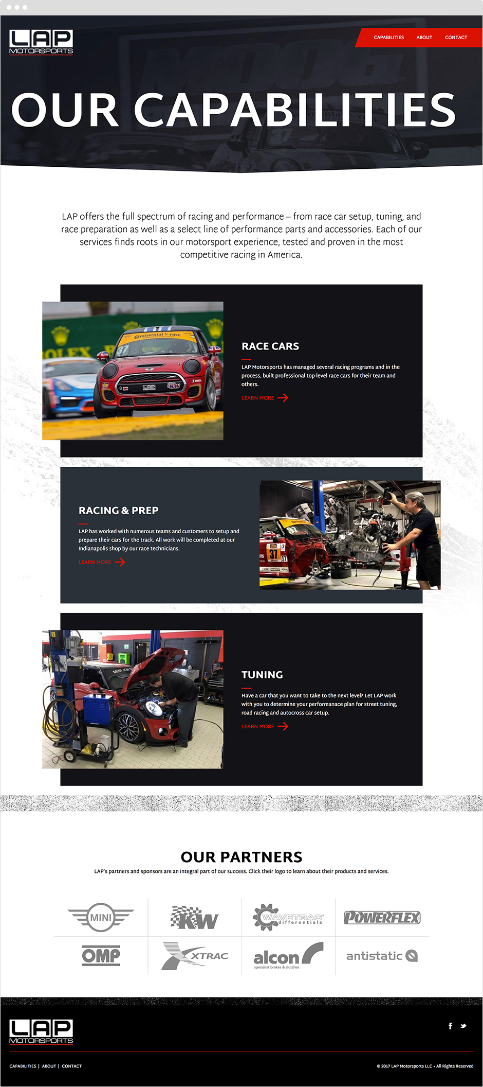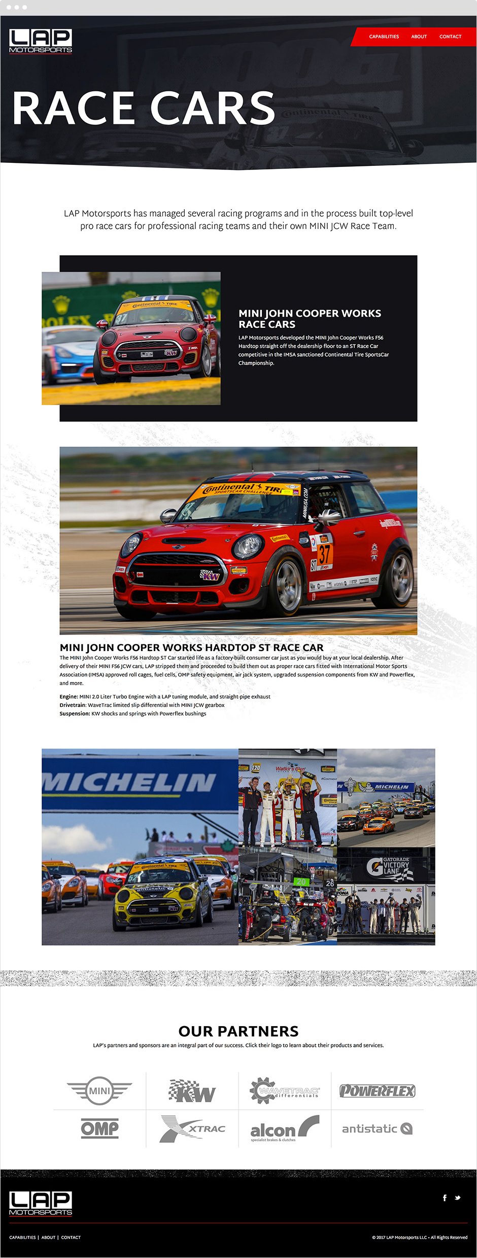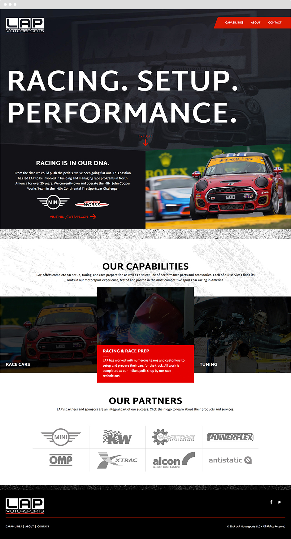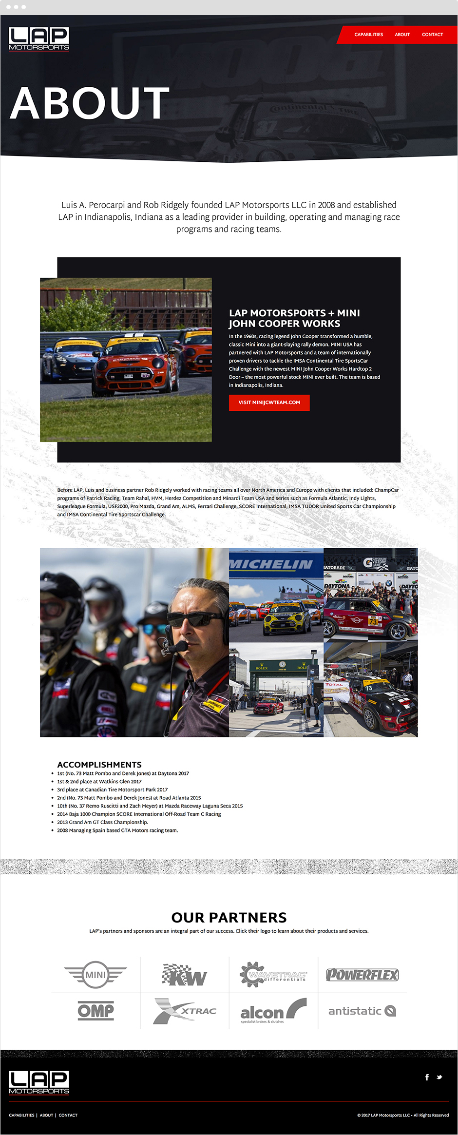 We were initially introduced to LAP Motorsports through our partnership with the MINI JCW Racing Team. We naturally hit it off and began to explore other opportunities which lead to rebranding their organization and creating a website to communicate their services and capabilities.