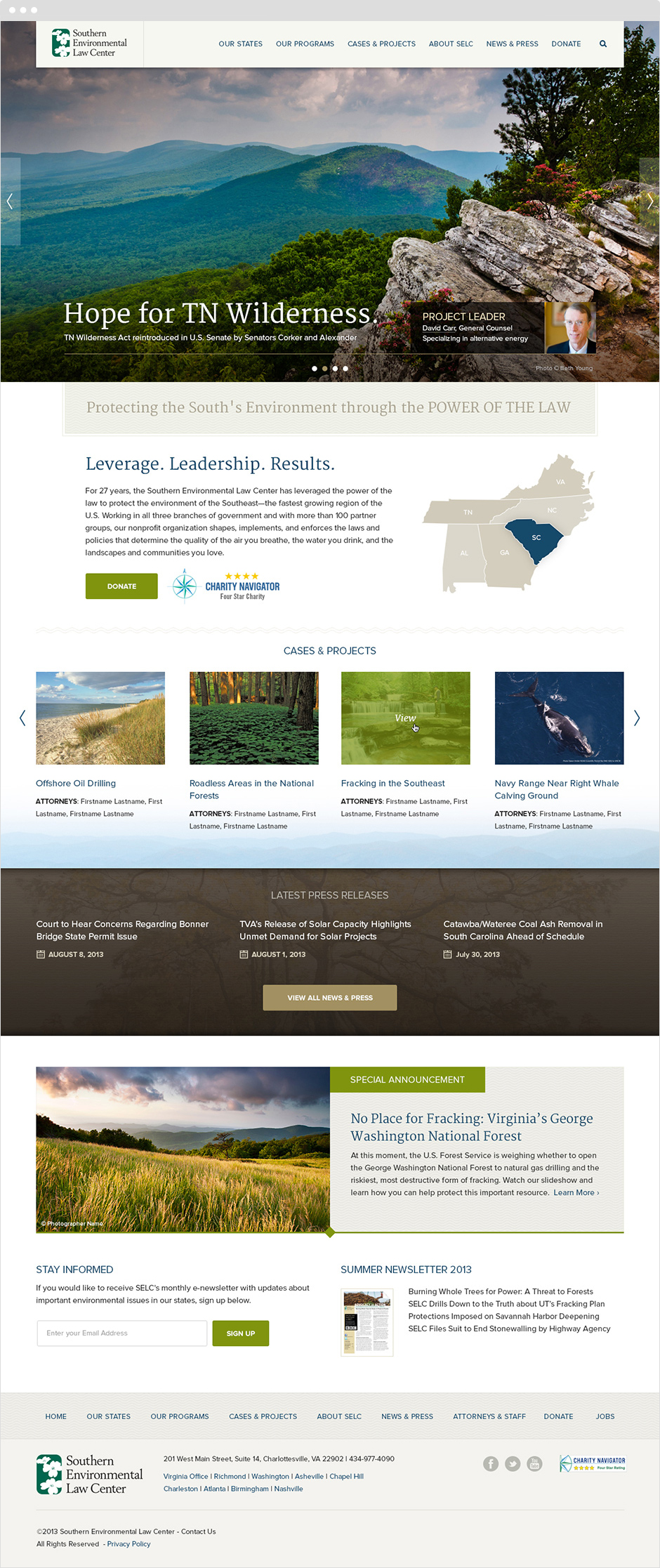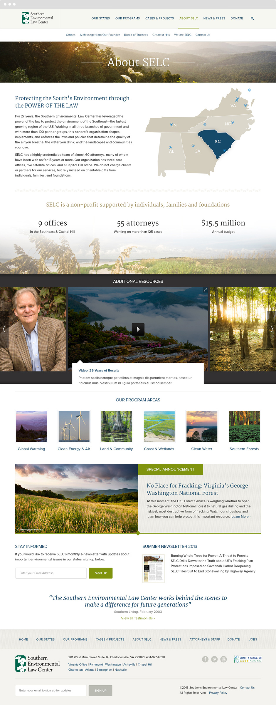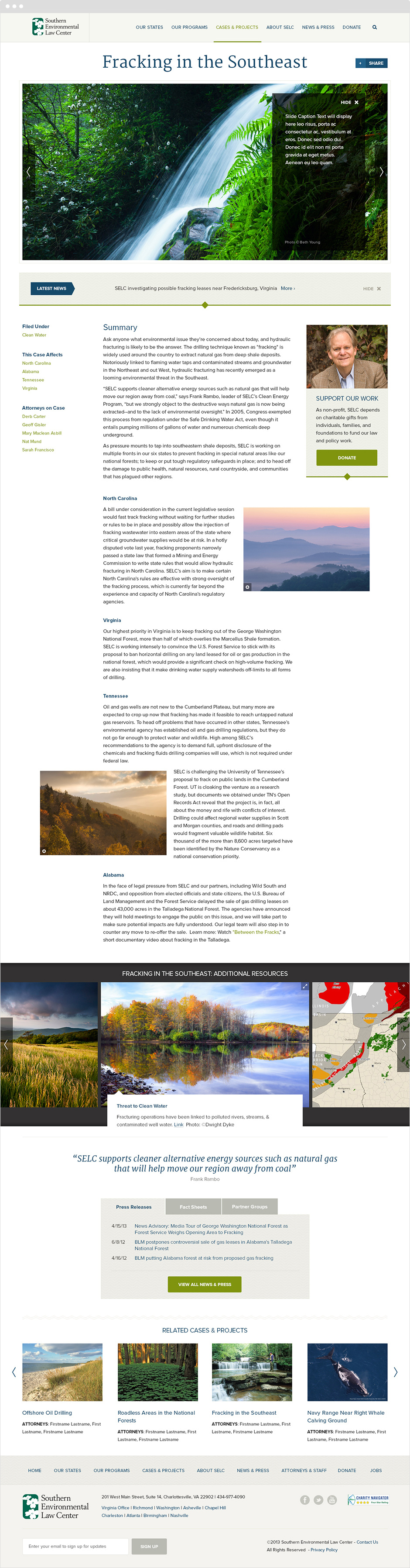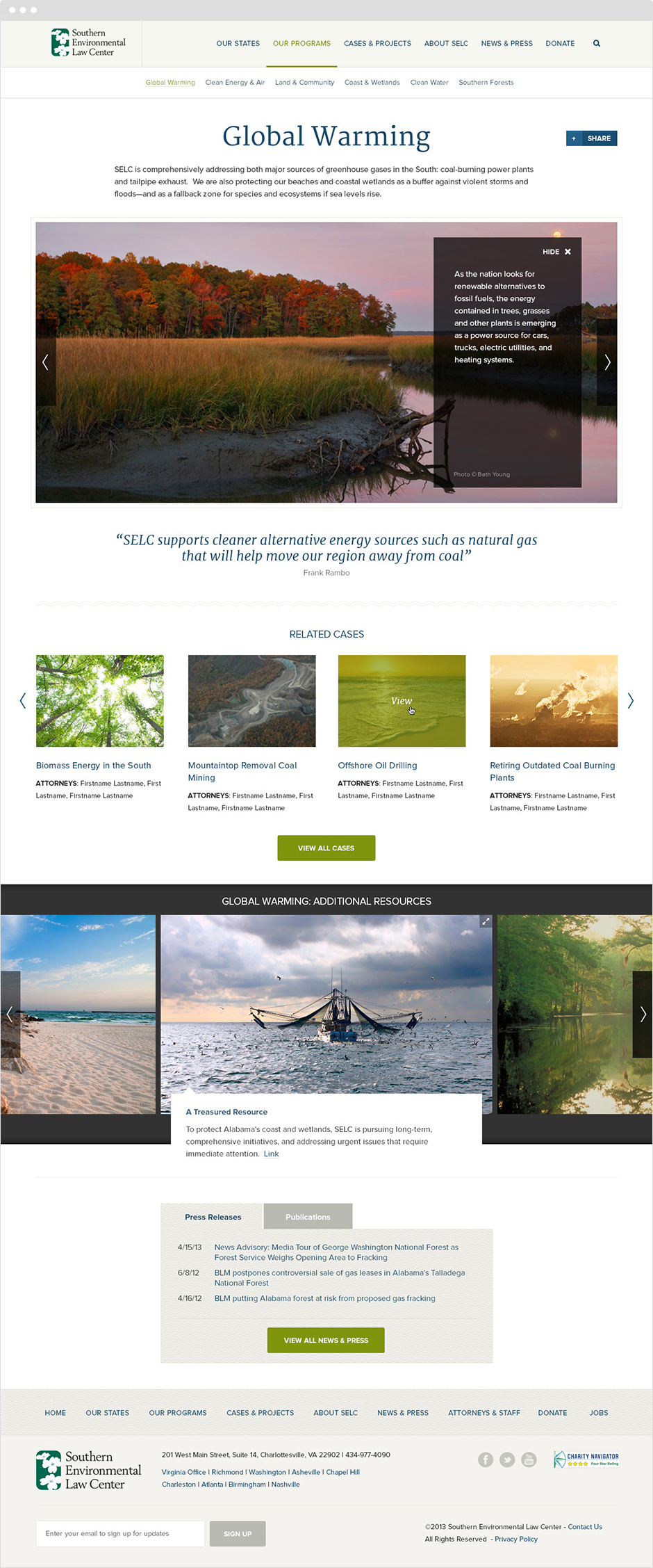The homepage of the new website highlights several key stories and high important cases along with special announcements and press releases. One of the major design goals for this page was to feature their photography as it relates to the states and cases they are working to protect.