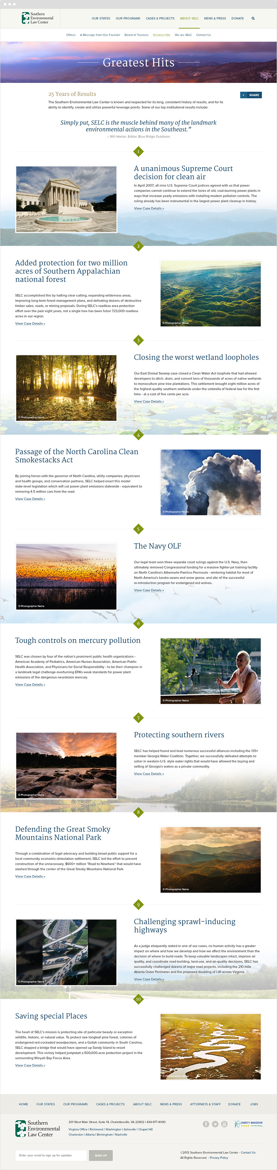 Southern Environmental Law Center's Greatest Hits page leads the user through their cases and legislation that have had the greatest impact on the environment.