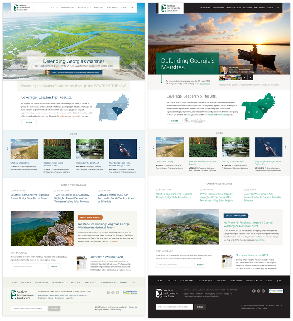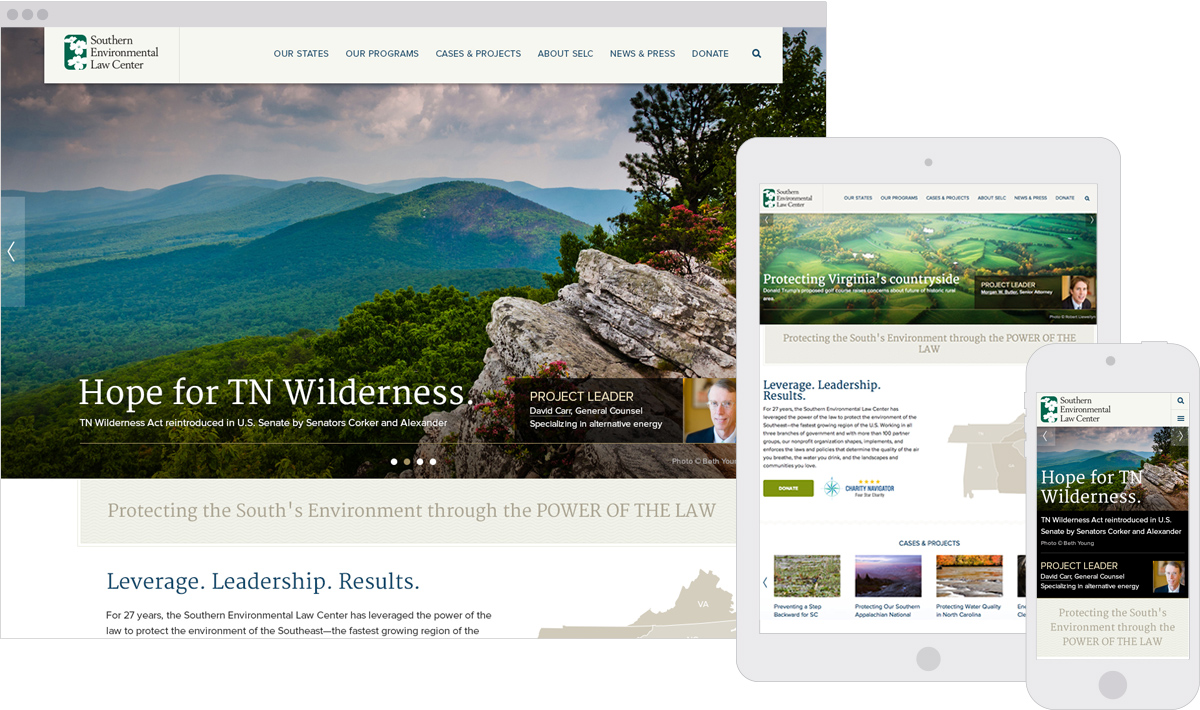 Upon final approval of the design, Visual Chefs - our development partner, turned our design system into responsive HTML templates which were implemented on ExpressionEngine for easy content management. The responsive nature of the new Southern Environmental Law Center website allows the design to adjust and provide every user the best experience, no matter what device they use (e.g., Desktop, laptop, tablet, phone, etc).